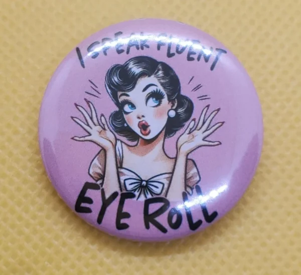 “I speak Fluent Eye Roll” – Pinback Badge | Lightweight, Button Badge (Choose your Size)
